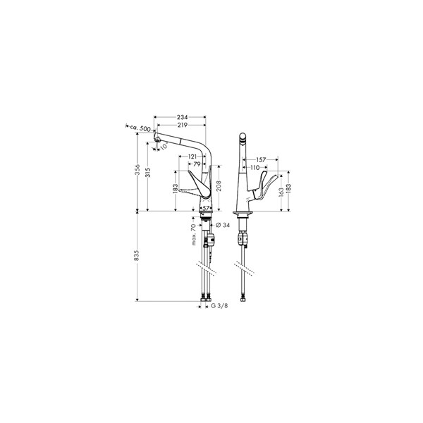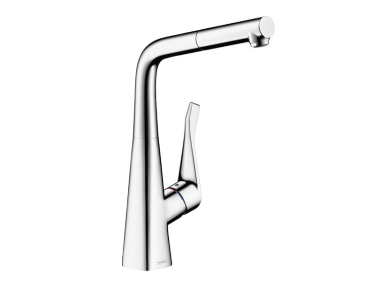 Смеситель для кухни, Hansgrohe, Metris M71, тип открывания воды-однорычажный, тип регулирования воды-керамический картридж, монтаж-на раковину/столешницу, отверстия для монтажа-1, высота, мм-356, вынос излива, мм-219, тип излива-выдвижной, поворотный, 1 режим струи-ламинарная струя, тип подводки-гибкая, стандарт подвода воды-3/8", цвет-хром Смеситель для кухни, Hansgrohe, Metris M71, цвет-хром