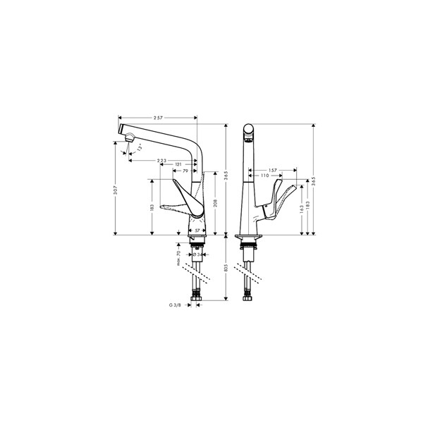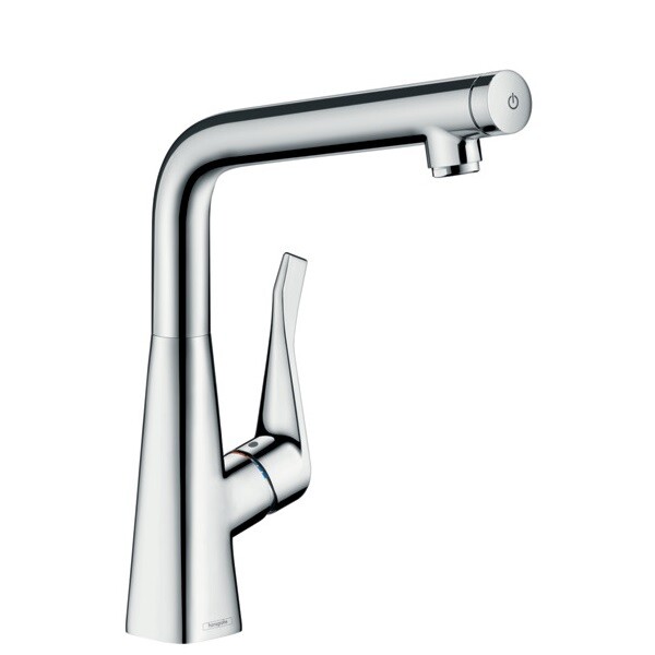 Смеситель для кухни, Hansgrohe, Metris Select M71, однорычажный, кнопка Select для комфортного включения/выключения воды, тип регулирования воды-керамический картридж, монтаж-на раковину/столешницу, отверстия для монтажа-1, высота, мм-365, вынос излива, мм-223, тип излива-поворотный, 1 режим струи-ламинарная струя, тип подводки-гибкая, стандарт подвода воды-3/8", цвет-хром Смеситель для кухни, Hansgrohe, Metris Select M71, цвет-хром