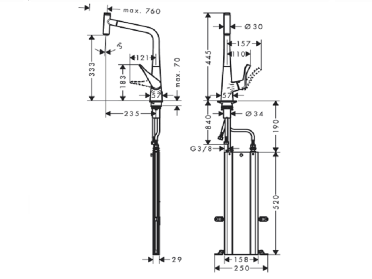 Смеситель для кухни, Hansgrohe, Metris Select M71, sBox, тип открывания воды-однорычажный, тип регулирования воды-керамический картридж, монтаж-на раковину/столешницу, отверстия для монтажа-1, высота, мм-445, вынос излива, мм-235, тип излива-выдвижной, поворотный на 110° или 150°, корпус для шланга, кнопка Select для комфортного включения/выключения воды, магнитная система крепления душа MagFit, тип подводки-гибкая, стандарт подвода воды-3/8", цвет-сталь Смеситель для кухни, Hansgrohe, Metris Select M71, sBox, цвет-сталь