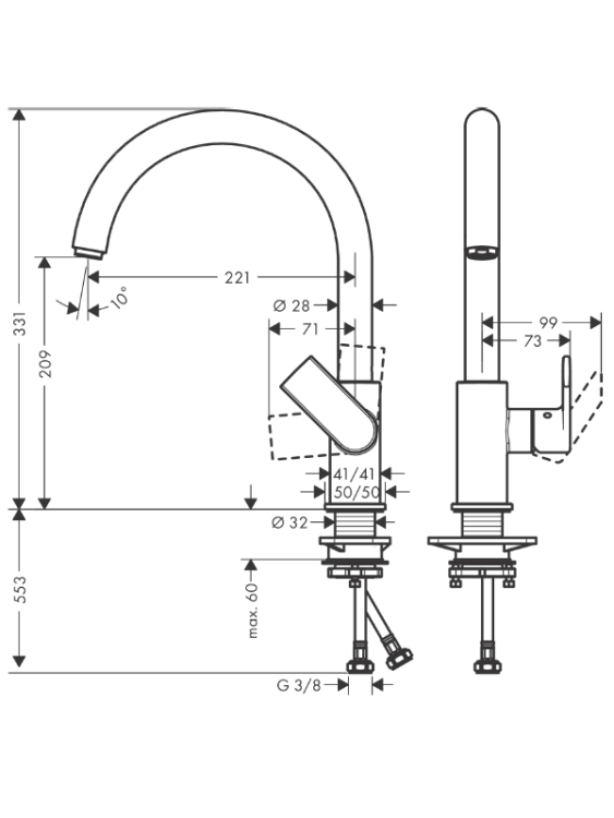 Смеситель для кухни, Hansgrohe, Vernis Shape M35, тип открывания воды-рычажный, тип регулирования воды-керамический картридж, тип установки-на раковину/столешницу, отверстия для монтажа-1, высота, мм-331, вынос излива, мм-221, тип излива-поворотный, тип подводки-гибкая, стандарт подвода воды-3/8", цвет-хром Смеситель для кухни, Hansgrohe, Vernis Shape M35, цвет-хром