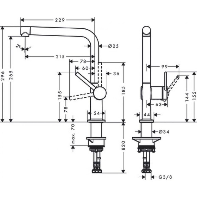 Смеситель для кухни, Hansgrohe, Talis M 54, тип открывания воды-однорычажный, тип регулирования воды-керамический картридж, монтаж-на раковину/столешницу, отверстия для монтажа-1, высота, мм-296, вынос излива, мм-215, тип излива-L-образный, поворотный 60°, 110°, 150° или 360°, тип подводки-гибкая, стандарт подвода воды-3/8", цвет-хром Смеситель для кухни, Hansgrohe, Talis M54, цвет-хром