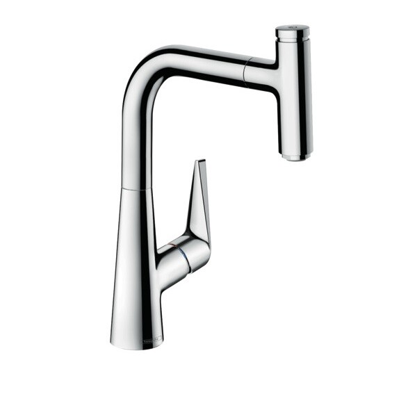 Смеситель для кухни, Hansgrohe, Talis Select M51, тип открывания воды-однорычажный, кнопка Select для комфортного включения/выключения воды, тип регулирования воды-керамический картридж, монтаж-на раковину/столешницу, отверстия для монтажа-1, высота, мм-335, вынос излива, мм-208, тип излива-выдвижной, поворотный 110° или 150°, 1 режим струи, магнитная система крепления душа MagFit, тип подводки-гибкая, стандарт подвода воды-3/8", цвет-хром Смеситель для кухни, Hansgrohe, Talis Select M51, цвет-хром