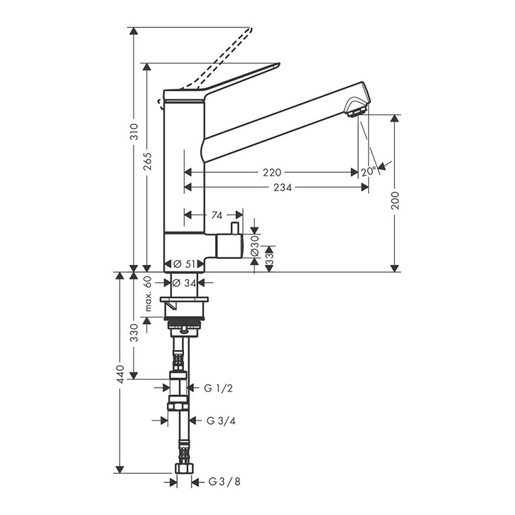 Смеситель для кухни, Hansgrohe, Zesis M33, тип открывания воды-однорычажный, тип регулирования воды-керамический картридж, монтаж-на раковину/столешницу, отверстия для монтажа-1, высота, мм-265, вынос излива, мм-220, тип излива-поворотный, регулировка на 2 уровня, на 60° и 110°, тип подводки-гибкая, стандарт подвода воды-3/8", с запорным вентилем, цвет-хром Смеситель для кухни, Hansgrohe, Zesis M33, с запорным вентилем, цвет-хром