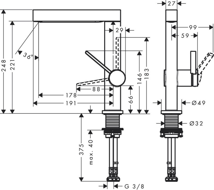 Смеситель для раковины, Hansgrohe, Finoris, тип открывания воды-однорычажный, тип регулирования воды-керамический картридж, монтаж-на раковину/столешницу, отверстия для монтажа-1, высота, мм-248, вынос излива, мм-178, тип излива-поворотный, донный клапан-есть, тип подводки-гибкая, стандарт подвода воды-3/8", цвет-хром Смеситель для раковины, Hansgrohe, Finoris, цвет-хром