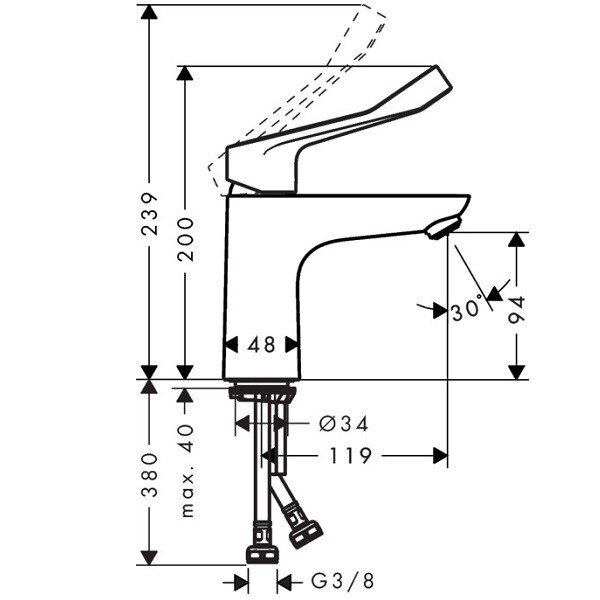 Смеситель для раковины, Hansgrohe, Focus, тип открывания воды-однорычажный, отверстия для монтажа-1, высота, мм-200, вынос излива, мм-119, тип подводки-гибкая, цвет-хром, без сливного гарнитура, с длинной ручкой Смеситель для раковины, Hansgrohe, Focus, цвет-хром