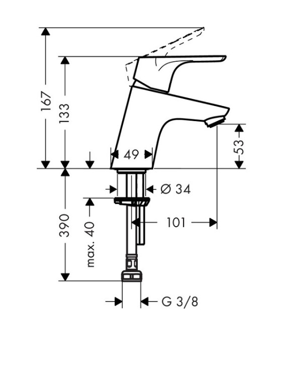 Смеситель для раковины, Hansgrohe, Focus, тип открывания воды-однорычажный, тип регулирования воды-керамический узел смешивания, тип установки-на раковину, отверстия для монтажа-1, высота, мм-167, вынос излива, мм-101, тип излива-неподвижный, цвет-хром, расход воды: 5 л / мин Смеситель для раковины, Hansgrohe, Focus, цвет-хром