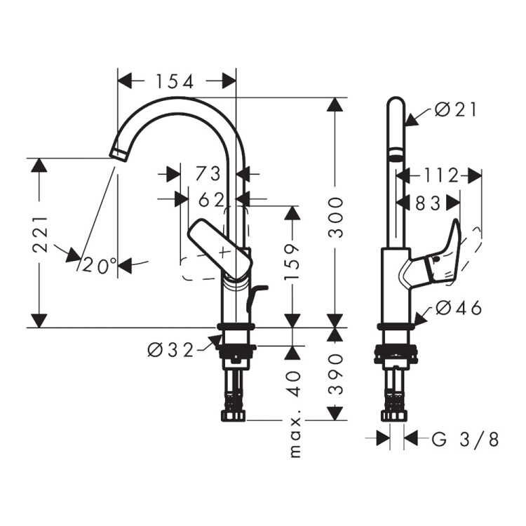 Смеситель для раковины, Hansgrohe, Logis, тип открывания воды-однорычажный, тип регулирования воды-керамический картридж, монтаж-на раковину/столешницу, отверстия для монтажа-1, высота, мм-300, вынос излива, мм-154, тип излива-поворотный, донный клапан-есть, тип подводки-гибкая, стандарт подвода воды-3/8", цвет-черный матовый Смеситель для раковины, Hansgrohe, Logis, цвет-черный матовый