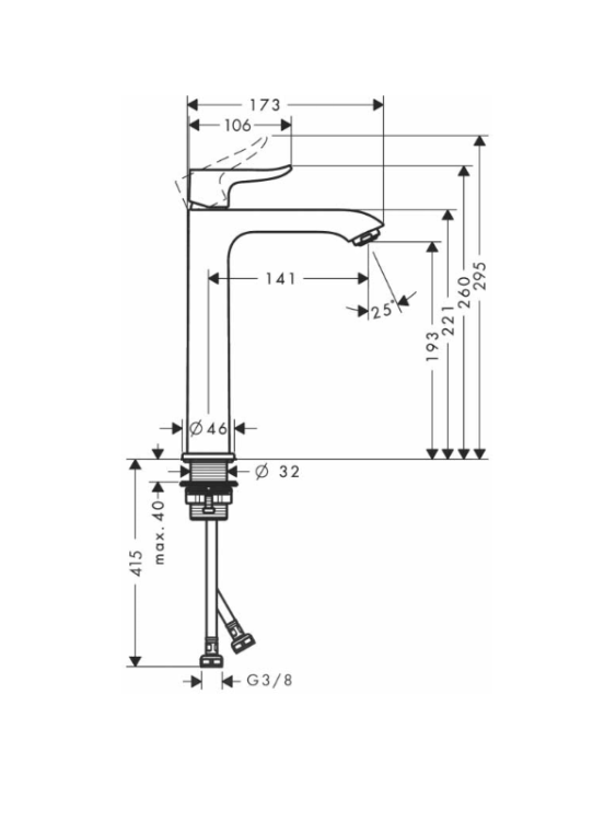 Смеситель для раковины, Hansgrohe, Metris, тип открывания воды-однорычажный, тип регулирования воды-керамический узел смешивания, отверстия для монтажа-1, высота, мм-260, вынос излива, мм-141, цвет-хром, без сливного гарнитура Смеситель для раковины, Hansgrohe, Metris, цвет-хром