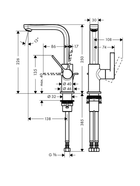 Смеситель для раковины, Hansgrohe, Metris S, тип открывания воды-однорычажный, тип регулирования воды-керамический узел смешивания, высота, мм-250, вынос излива, мм-138, тип излива-поворотный, цвет-хром, регулируемое ограничение температуры Смеситель для раковины, Hansgrohe, Metris S, цвет-хром