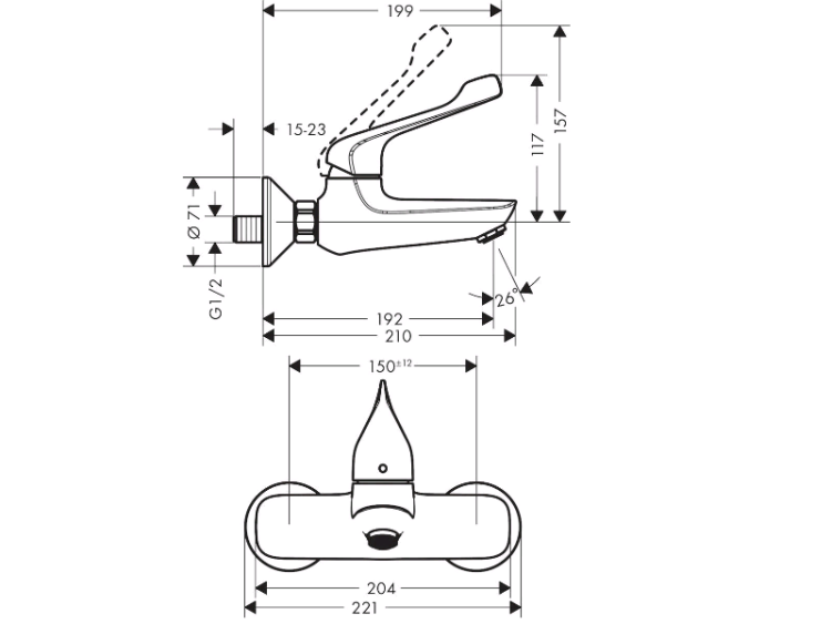 Смеситель для раковины, Hansgrohe, Novus Care, тип открывания воды-однорычажный, тип установки-настенный, отверстия для монтажа-2, вынос излива, мм-192, цвет-хром Смеситель для раковины, Hansgrohe, Novus Care, цвет-хром