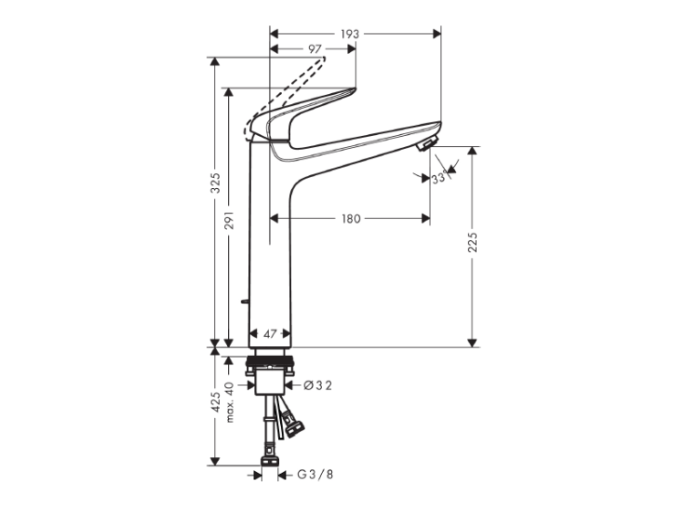 Смеситель для раковины, Hansgrohe, Novus, тип открывания воды-однорычажный, тип регулирования воды-картридж Eco, отверстия для монтажа-1, высота, мм-291, вынос излива, мм-193, донный клапан-есть, тип подводки-гибкая, стандарт подвода воды-3/8", цвет-хром Смеситель для раковины, Hansgrohe, Novus, цвет-хром