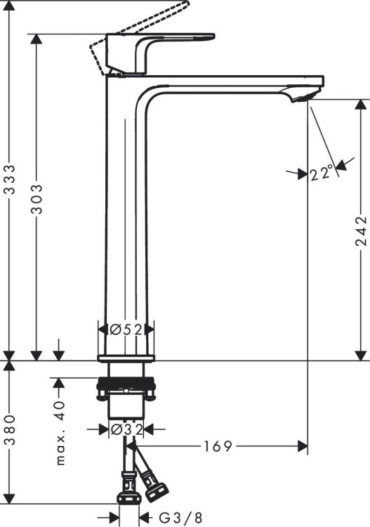 Смеситель для раковины, Hansgrohe, Rebris S, CoolStart, тип открывания воды-однорычажный, тип регулирования воды-керамический картридж, монтаж-на раковину/столешницу, отверстия для монтажа-1, высота, мм-303, вынос излива, мм-169, тип излива-неподвижный, донный клапан-отсутствует, тип подводки-гибкая, стандарт подвода воды-3/8", цвет-хром Смеситель для раковины, Hansgrohe, Rebris S, CoolStart, цвет-хром