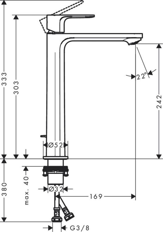 Смеситель для раковины, Hansgrohe, Rebris S, CoolStart EcoSmart+, тип открывания воды-однорычажный, тип регулирования воды-керамический картридж, монтаж-на раковину/столешницу, отверстия для монтажа-1, высота, мм-303, вынос излива, мм-169, тип излива-неподвижный, донный клапан-есть, тип подводки-гибкая, стандарт подвода воды-3/8", цвет-хром Смеситель для раковины, Hansgrohe, Rebris S, CoolStart EcoSmart+, цвет-хром