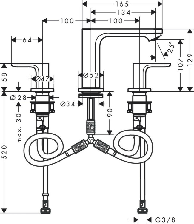 Смеситель для раковины, Hansgrohe, Rebris S, тип открывания воды-двухвентильный, тип регулирования воды-керамическая кран-букса, монтаж-на раковину/столешницу, отверстия для монтажа-3, высота, мм-129, вынос излива, мм-134, тип излива-неподвижный, донный клапан-есть, тип подводки-гибкая, стандарт подвода воды-3/8", цвет-хром Смеситель для раковины, Hansgrohe, Rebris S, цвет-хром