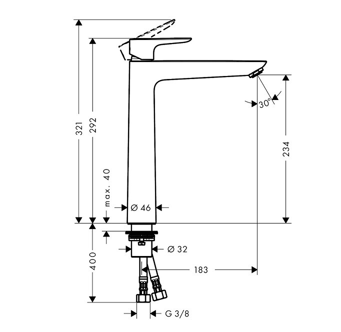 Смеситель для раковины, Hansgrohe, Talis E, тип открывания воды-однорычажный, тип регулирования воды-керамический узел смешивания, монтаж-на раковину/столешницу, отверстия для монтажа-1, высота, мм-292, вынос излива, мм-183, тип излива-неподвижный, донный клапан-отсутствует, тип подводки-гибкая, стандарт подвода воды-3/8", цвет-белый матовый Смеситель для раковины, Hansgrohe, Talis E, цвет-белый матовый