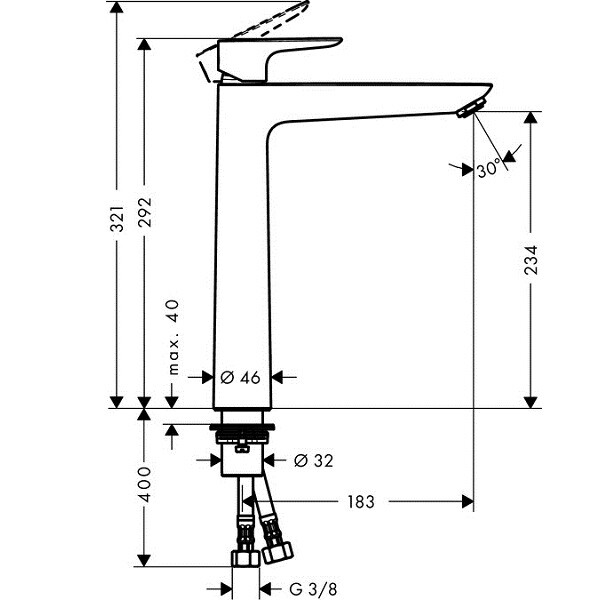 Смеситель для раковины, Hansgrohe, Talis E, тип открывания воды-однорычажный, тип регулирования воды-керамический узел смешивания, отверстия для монтажа-1, высота, мм-292, вынос излива, мм-183, цвет-хром, без сливного гарнитура Смеситель для раковины, Hansgrohe, Talis E, цвет-хром