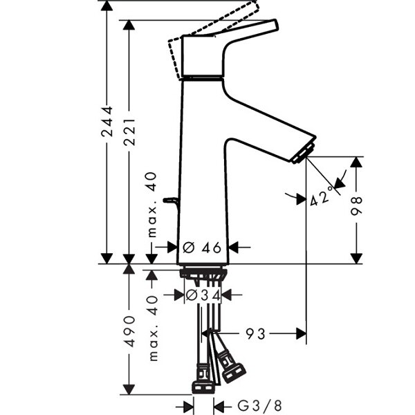 Смеситель для раковины, Hansgrohe, Talis S, тип открывания воды-однорычажный, тип регулирования воды-керамический узел смешивания, отверстия для монтажа-1, высота, мм-221, вынос излива, мм-93, стандарт подвода воды-3/8", цвет-хром, регулируемое ограничение температуры Смеситель для раковины, Hansgrohe, Talis S, цвет-хром