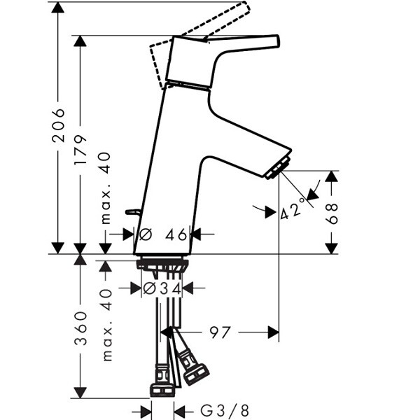 Смеситель для раковины, Hansgrohe, Talis S, тип открывания воды-рычажный, тип регулирования воды-керамический картридж, монтаж-горизонтальный (на раковину/столешницу), отверстия для монтажа-1, высота, мм-179, вынос излива, мм-97, тип излива-неподвижный, материал ручки-металл, донный клапан-есть, тип подводки-гибкая, стандарт подвода воды-3/8", цвет изделия-хром, регулируемое ограничение температуры Смеситель для раковины, Hansgrohe, Talis S, цвет изделия-хром