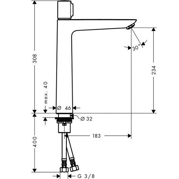 Смеситель для раковины, Hansgrohe, Talis Select E, тип открывания воды-однорычажный, высота, мм-308, вынос излива, мм-183, цвет-хром, без сливного гарнитура Смеситель для раковины, Hansgrohe, Talis Select E, цвет-хром