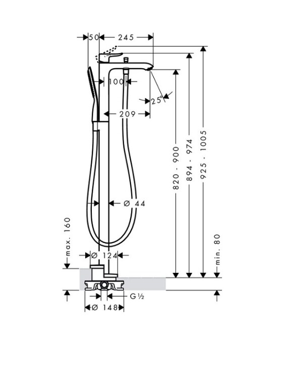 Смеситель для ванны и душа, Hansgrohe, Metris, тип открывания воды-однорычажный, тип регулирования воды-керамический узел смешивания, тип установки-напольный, вынос излива, мм-245, комплектация-переключатель вакуумного типа, ручной мини-душ, , внутренняя часть-необходимо заказать, цвет-хром, встроенный держатель душа Смеситель для ванны и душа, Hansgrohe, Metris, цвет-хром
