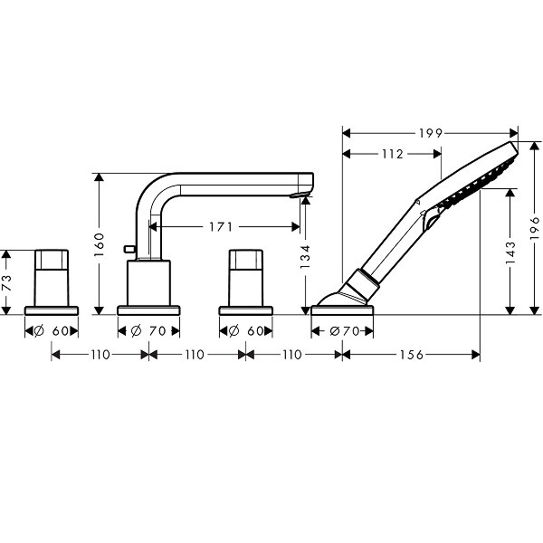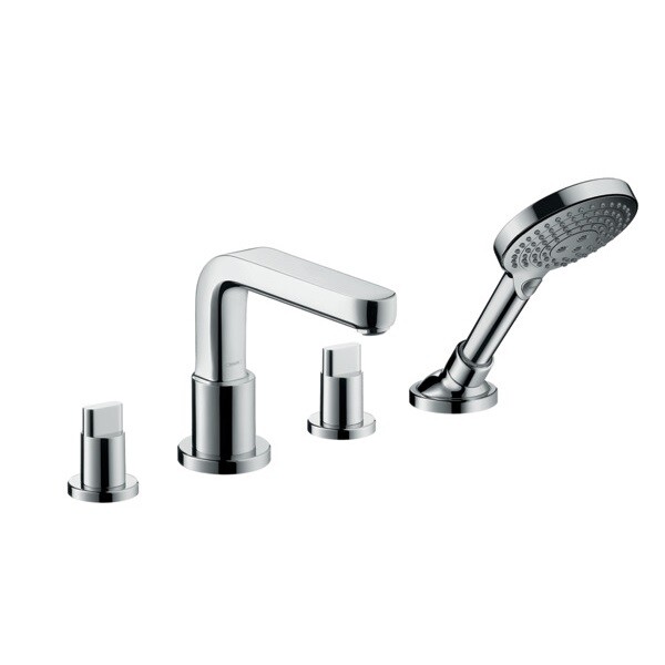 Смеситель для ванны и душа, Hansgrohe, Metris S, тип открывания воды-двухвентильный, тип регулирования воды-керамический вентиль, тип установки-на край ванны, отверстия для монтажа-4, вынос излива, мм-171, комплектация-рукоятки, розетка, переключатель, излив на ванну, цвет-хром, встроенный держатель душа Смеситель для ванны и душа, Hansgrohe, Metris S, цвет-хром