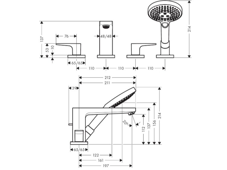 Смеситель для ванны и душа, Hansgrohe, Metropol, тип открывания воды-двухрычажный, тип регулирования воды-керамический вентиль, тип установки-на борт ванны, отверстия для монтажа-4, вынос излива, мм-197, внутренняя часть-необходимо заказать, цвет-хром, тип струи смесителя-обычная струя, комплектация: ручной душ, тип струи ручного душа-Rain, RainAir, Whirl, шланг для душа, максимальное расстояние, на которое вытягивается ручной душ,мм-1100 , держатель для душа Смеситель для ванны и душа, Hansgrohe, Metropol, цвет-хром
