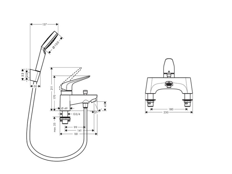 Смеситель для ванны и душа, Hansgrohe, Novus, тип открывания воды-однорычажный, тип регулирования воды-керамический картридж, тип установки-на борт ванны, отверстия для монтажа-3, вынос излива, мм-141, цвет-хром, в комплекте-ручной душ, держатель ручного душа Смеситель для ванны и душа, Hansgrohe, Novus, цвет-хром