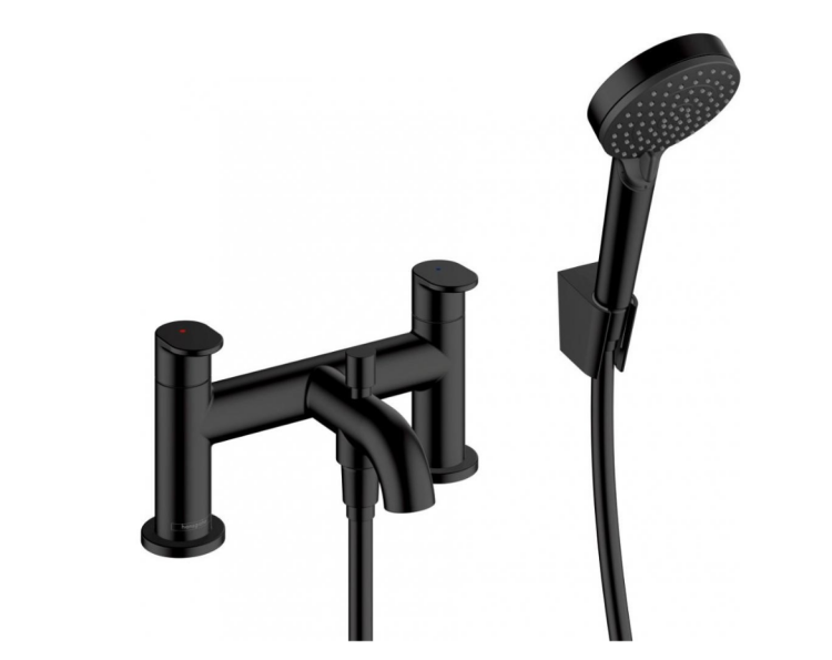 Смеситель для ванны и душа, Hansgrohe, Vernis Blend, тип открывания воды-вентильный, тип регулирования воды-керамическая кран-букса, монтаж-на борт ванны, отверстия для монтажа-3, вынос излива, мм-110, ручной душ-в комплекте, с переключающим вентилем, цвет-черный матовый Смеситель для ванны и душа, Hansgrohe, Vernis Blend, цвет-черный матовый