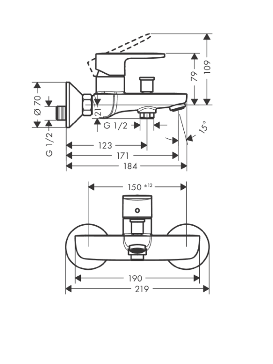 Смеситель для ванны и душа, Hansgrohe, Vernis Blend, тип открывания воды-рычажный, тип регулирования воды-керамический картридж, тип установки-настенный, отверстия для монтажа-2, вынос излива, мм-171, тип излива-неподвижный, материал ручки-металл, цвет ручки-в цвет смесителя, цвет-черный матовый Смеситель для ванны и душа, Hansgrohe, Vernis Blend, цвет-черный матовый