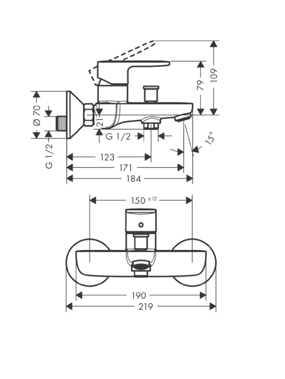Смеситель для ванны и душа, Hansgrohe, Vernis Blend, тип открывания воды-рычажный, тип регулирования воды-керамический картридж, тип установки-настенный, отверстия для монтажа-2, вынос излива, мм-171, тип излива-неподвижный, материал ручки-металл, цвет ручки-в цвет смесителя, цвет-хром Смеситель для ванны и душа, Hansgrohe, Vernis Blend, цвет-хром
