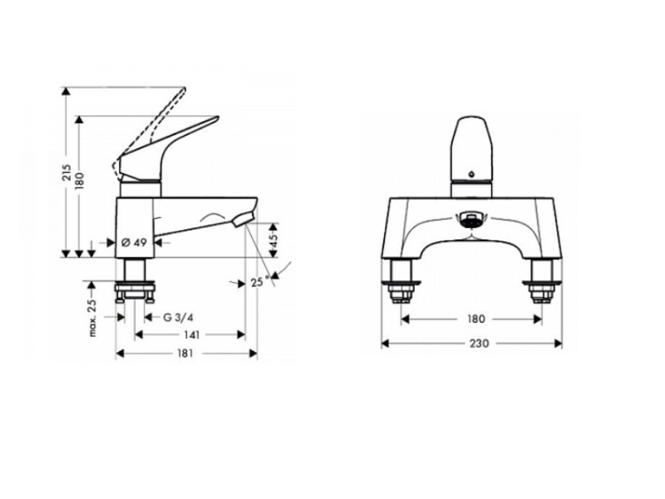 Смеситель для ванны, Hansgrohe, Metris, тип открывания воды-однорычажный, тип регулирования воды-керамический узел смешивания, тип установки-на край ванны, отверстия для монтажа-2, вынос излива, мм-141, тип излива-неподвижный, комплектация-переключатель, обратный клапан с шумопоглотителем, цвет-хром Смеситель для ванны, Hansgrohe, Metris, цвет-хром