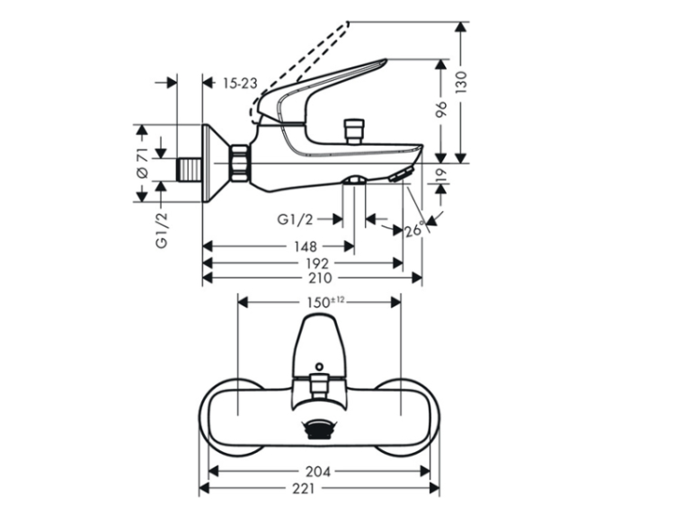 Смеситель для ванны и душа, Hansgrohe, Novus, тип открывания воды-однорычажный, тип установки-настенный, отверстия для монтажа-2, вынос излива, мм-192, тип излива-неподвижный, комплектация-переключатель, цвет-хром Смеситель для ванны, Hansgrohe, Novus, цвет-хром