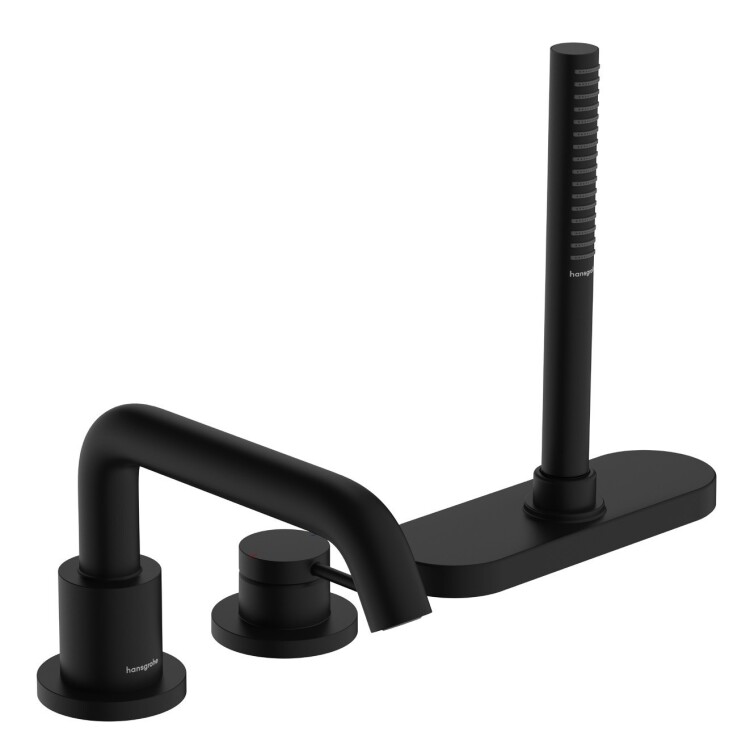 Смеситель для ванны, Hansgrohe, Tecturis S, тип открывания воды-однорычажный, тип регулирования воды-керамический картридж, монтаж-на борт ванны, отверстия для монтажа-3, вынос излива, мм-194, в комплекте-ручной душ, держатель для душа, душевой шланг, короб для шланга, количество режимов ручного душа-2, тип струи ручного душа-Rain, MonoRain, внутренняя часть-необходимо заказать, цвет-черный матовый Смеситель для ванны, Hansgrohe, Tecturis S, цвет-черный матовый
