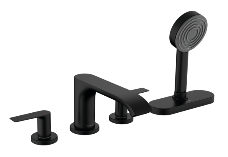 Смеситель для ванны, Hansgrohe, Vivenis, тип открывания воды-духвентильный, тип регулирования воды-керамический узел смешивания, монтаж-на край ванны, отверстия для монтажа-4, вынос излива, мм-200, ручной душ-в комплекте, внутренняя часть-необходимо заказать, цвет-черный матовый Смеситель для ванны, Hansgrohe, Vivenis, цвет-черный матовый