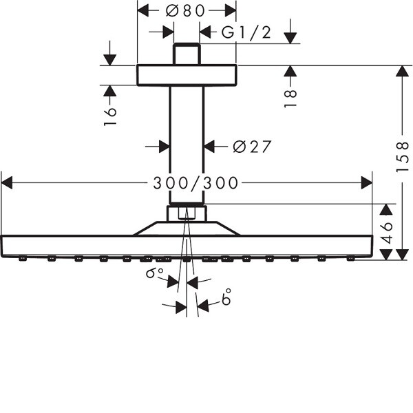 Верхний душ, Hansgrohe, Raindance E, тип установки-потолочный, размер душевого диска, мм-300*300, форма-квадратная, количество режимов-1, тип струи-RainAir, держатель-есть, размер держателя-158, цвет-хром Верхний душ, Hansgrohe, Raindance E, 300*300, цвет-хром