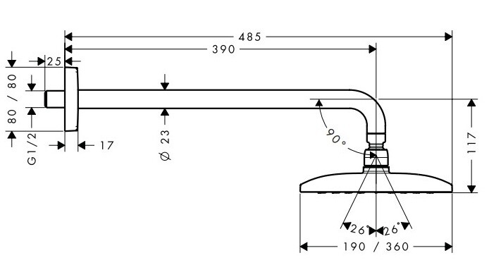 Верхний душ, Hansgrohe, Raindance E, тип установки-настенный, размер душевого диска, мм-360*190, форма-прямоугольная, количество режимов-1, тип струи-RainAir, держатель-есть, размер держателя-390, цвет-хром Верхний душ, Hansgrohe, Raindance E, 360*190, цвет-хром