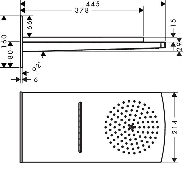 Верхний душ, Hansgrohe, Raindance Rainfall, тип установки-настенный, ширина, мм-214, глубина, мм-445, высота, мм-160, форма-прямоугольная, количество режимов-2, тип струи-RainAir, ливневая струя, внутренняя часть-необходимо заказать, цвет-белый/хром Верхний душ, Hansgrohe, Raindance Rainfall, шгв 214*445*160, цвет-белый/хром