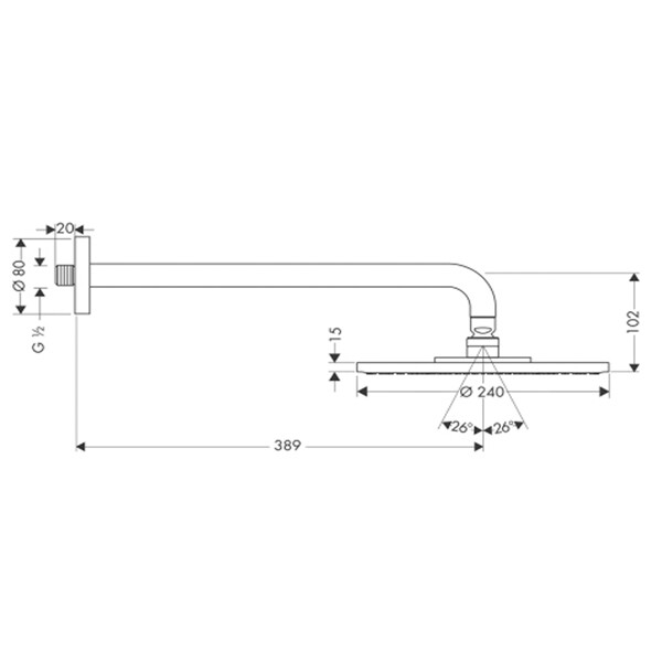 Верхний душ, Hansgrohe, Raindance S, тип установки-настенный, размер душевого диска, мм-240*240, форма-круглая, количество режимов-1, тип струи-RainAir, держатель-есть, размер держателя-390, цвет-хром Верхний душ, Hansgrohe, Raindance S, 240*240, цвет-хром