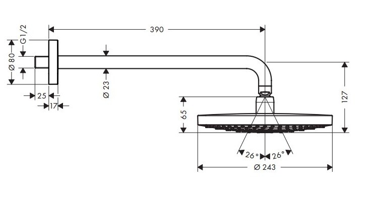 Верхний душ, Hansgrohe, Raindance Select S, тип установки-настенный, размер душевого диска, мм-240*240, форма-круглая, количество режимов-2, тип струи-Rain, RainAir, держатель-есть, размер держателя-390, цвет-белый/хром Верхний душ, Hansgrohe, Raindance Select S, 240*240, цвет-белый/хром