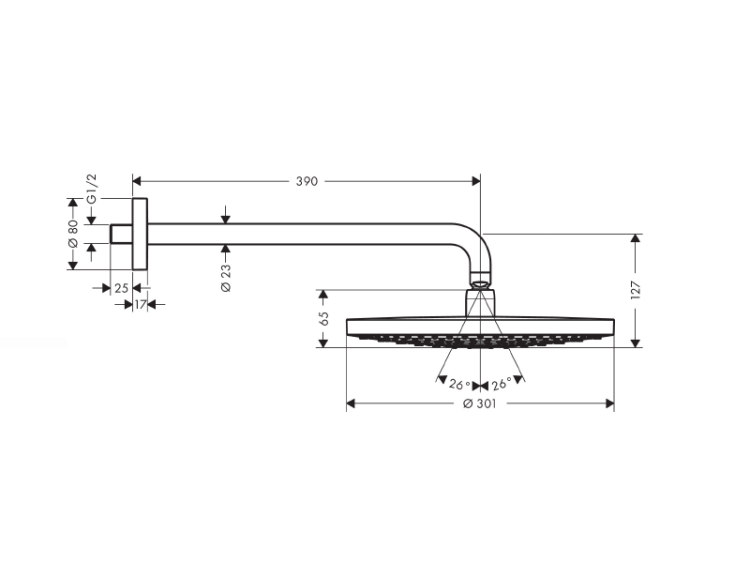 Верхний душ, Hansgrohe, Raindance Select S, тип установки-настенный, размер душевого диска, мм-300*300, форма-круглая, количество режимов-2, тип струи-Rain, RainAir, держатель-есть, размер держателя-390, цвет-белый/хром Верхний душ, Hansgrohe, Raindance Select S, 300*300, цвет-белый/хром