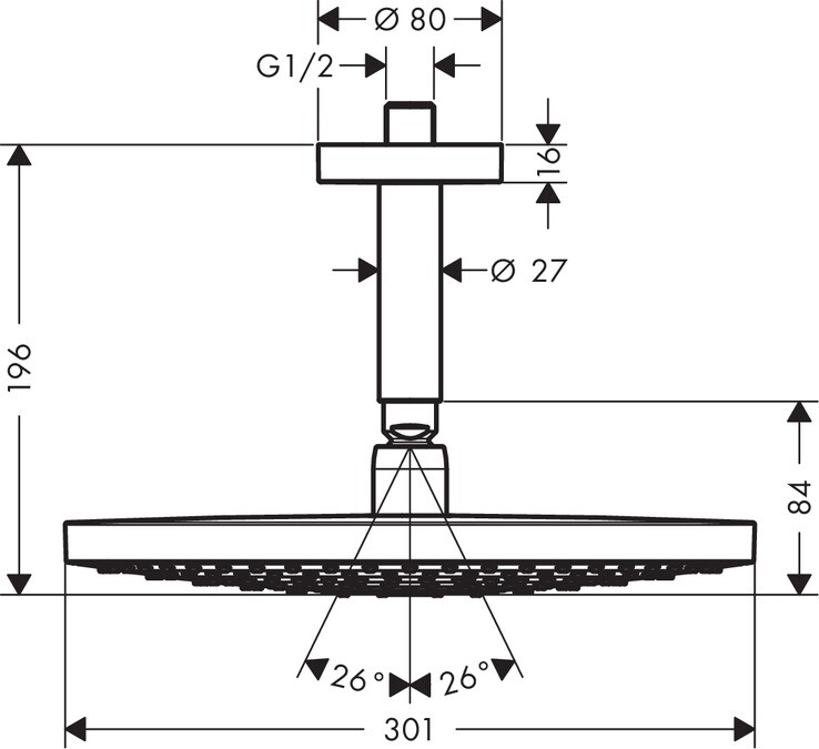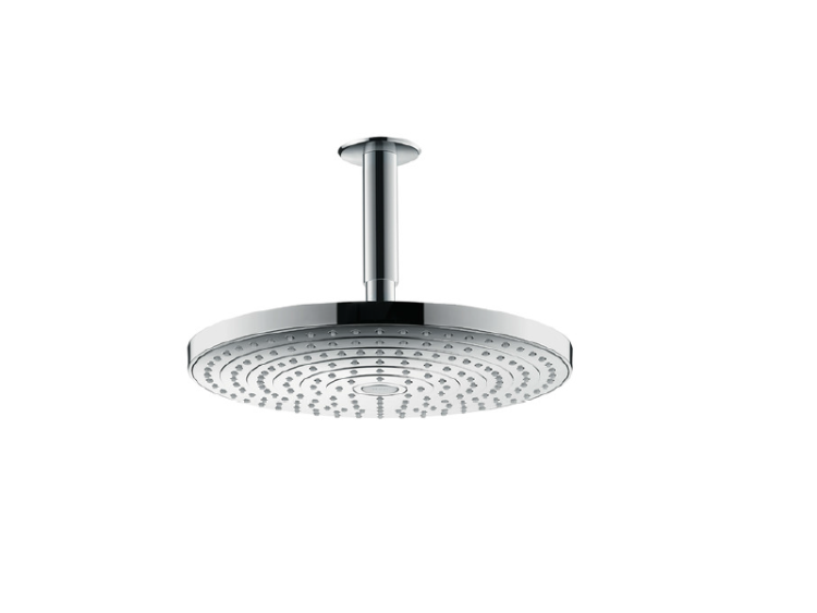 Верхний душ, Hansgrohe, Raindance Select S, тип установки-потолочный, размер душевого диска, мм-300*300, форма-круглая, количество режимов-2, тип струи-Rain, RainAir, держатель-есть, размер держателя-100, цвет-хром Верхний душ, Hansgrohe, Raindance Select S, 300*300, цвет-хром