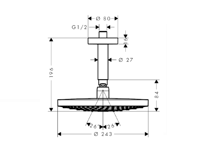 Верхний душ, Hansgrohe, Raindance Select S, тип установки-потолочный, ширина, мм-240, глубина, мм-240, высота, мм-84, форма-круглая, количество режимов-2, тип струи-Rain, RainAir, держатель-есть, размер держателя-100, цвет-белый/хром Верхний душ, Hansgrohe, Raindance Select S, цвет-белый/хром