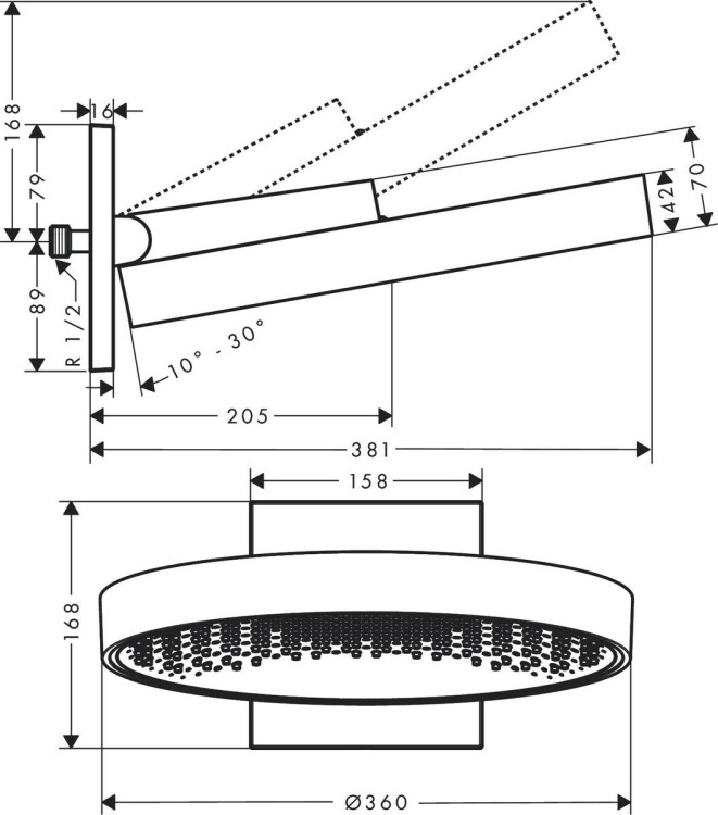 Верхний душ, Hansgrohe, Rainfinity, тип установки-настенный, ширина, мм-360, глубина, мм-381, высота, мм-168, форма-круглая, количество режимов-1, тип струи-PowderRain, держатель-есть, цвет-матовый черный, диаметр душевой лейки,мм-360, душевой кронштейн вертикально наклоняется на 10-30 °, поверхность распылительного диска-графит, материал распылительного диска-алюминий, соединительная резьба G ½ Верхний душ, Hansgrohe, Rainfinity, шгв 360*381*168, цвет-матовый черный