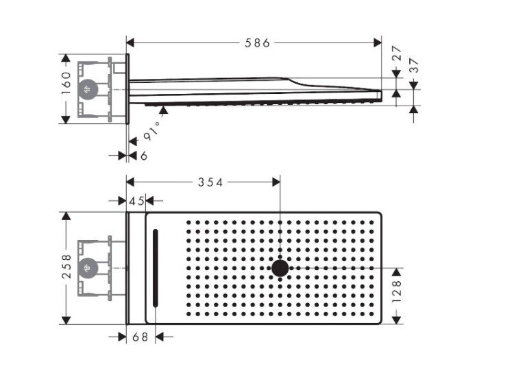 Верхний душ, Hansgrohe, Rainmaker Select, тип установки-настенный, ширина, мм-258, глубина, мм-586, высота, мм-160, форма-прямоугольная, количество режимов-3, тип струи-Rain, Rainflow Waterfall, Mono, внутренняя часть-необходимо заказать, материал душевого диска-безопасное стекло, съемный душевой диск для очистки, цвет-черный/хром Верхний душ, Hansgrohe, Rainmaker Select, шгв 258*586*160, цвет-черный/хром