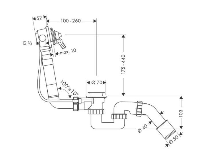 Внутрення часть, Hansgrohe, Exafill, назначение-для излива на ванну, с набором для слива и перелива, подходит для стандартных ванн, длина боуден-троса,мм-520, соединение шланга для подачи воды слева и справа Внутрення часть, Hansgrohe, Exafill, для излива на ванну