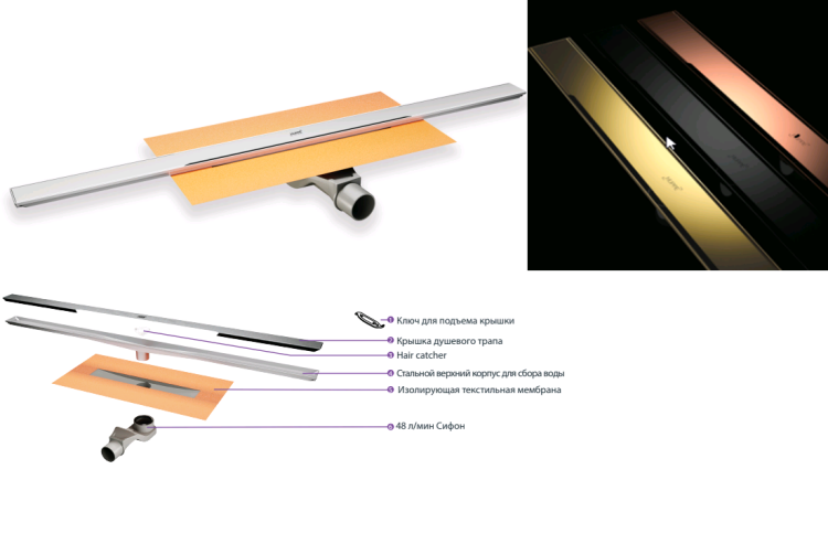 Линейный душевой трап, Huppe, Galata A, длина, мм-600, высота, мм-13, монтаж-встраеваемый под плитку с горизонтальным выпуском, пропускная способность, л/сек-0.8, сифон-есть, в комплекте-стальной корпус душевого трапа, крышка душевого трапа, грязеуловитель, детали для регулировки высоты, ключ для подьема крышки, подрезать нельзя, материал-нержавеющая сталь, цвет-медь блестящая Линейный душевой трап, Huppe, Galata A, дв 600*13, цвет-медь блестящая