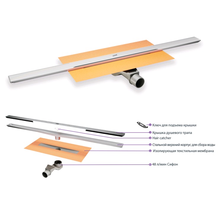 Линейный душевой трап, Huppe, Galata A, длина, мм-800, высота, мм-13, монтаж-встраеваемый под плитку с горизонтальным выпуском, пропускная способность, л/сек-0.8, сифон-есть, в комплекте-стальной корпус душевого трапа, крышка душевого трапа, грязеуловитель, детали для регулировки высоты, ключ для подьема крышки, подрезать нельзя, материал-нержавеющая сталь, цвет-сатин матовый Линейный душевой трап, Huppe, Galata A, дв 800*13, цвет-сатин матовый