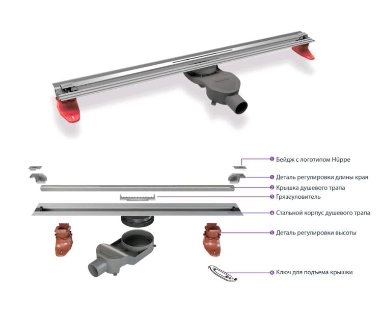 Линейный душевой трап, Huppe, llusion, длина, мм-600, монтаж-встраеваемый под плитку с горизонтальным выпуском, пропускная способность, л/сек-0.7, сифон-есть, комплектация-стальной корпус душевого трапа, крышка душевого трапа, грязеуловитель, детали для регулировки высоты, ключ для подьема крышки, можно подрезать до 35 см., материал-нержавеющая сталь, цвет-хром Линейный душевой трап, Huppe, llusion, д 600, цвет-хром