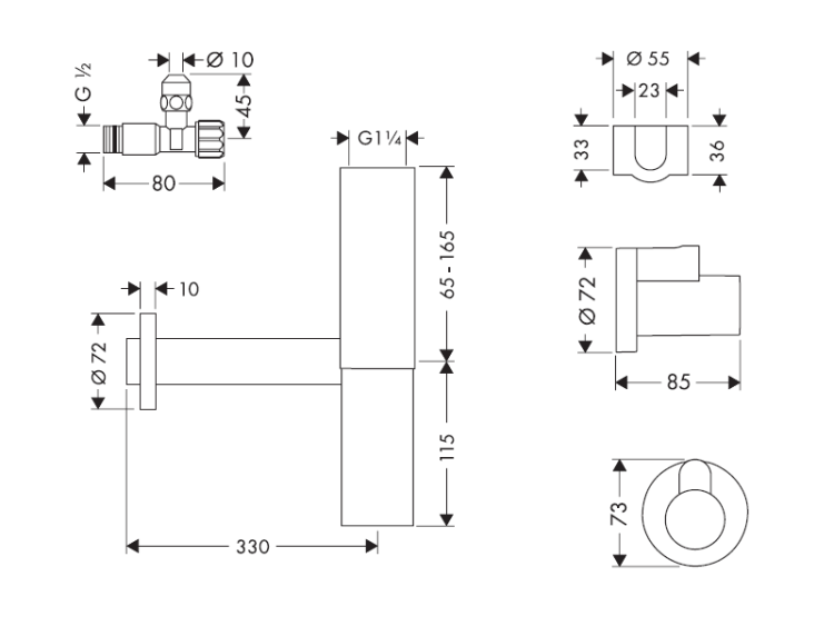Сифон, Hansgrohe, Flowstar, назначение-для раковины, ширина, мм-72, глубина, мм-330, высота, мм-280, тип-бутылочный, размер ввод/отвод-1 1/4", состоит из: дизайнерский сифон Flowstar (52100000), вентиль угловой, (13954000), декоративная накладка (13950000), Flowstar design trap (51303000), Cover (51306000), Angle valve with cover (51307000), цвет-хром Сифон, Hansgrohe, Flowstar, для раковины, цвет-хром