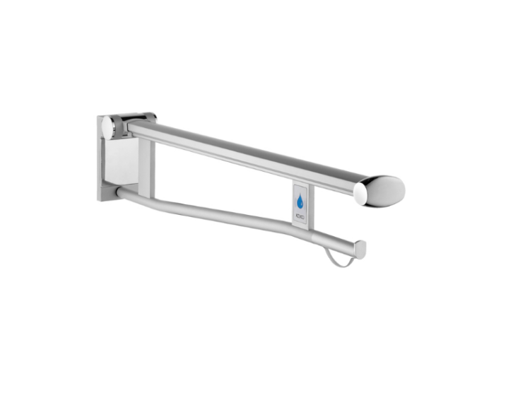 Поручень, Keuco, Plan Care, складной, ширина, мм-110, глубина, мм-850, высота, мм-182, тип установки-настенный, правый, без креплений, цвет-хром/светло-серый (RAL 7035), со встроенным радиоуправляемым смывом для туалета, сенсорной кнопкой и питанием от батареи, рукоятка откидывается наверх, поверхность контакта обшита пластиком, со съемным держателем туалетной бумаги Поручень, Keuco, Plan Care, складной, шгв 110*850*182, правый, цвет-хром/светло-серый (RAL 7035)